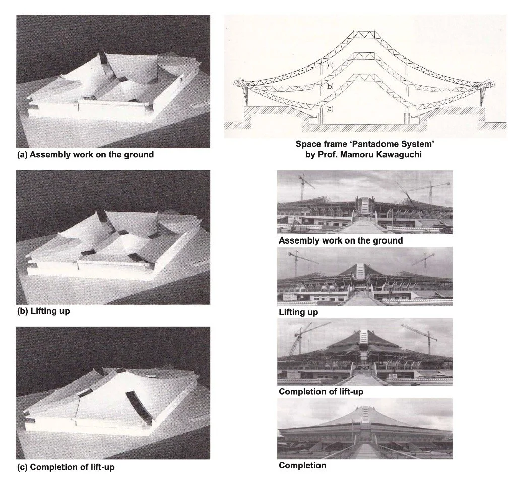 The design first arose almost forty years ago when Japanese architect Professor Kenzo Tange was appointed by the Singapore government to partner Singapore-based RSP Architects Planners & Engineers to help develop an indoor stadium in 1985. He and his team, including Yasuhiro Ishino and Paul Tange, his son, set about coming with a building that would blend in with its waterfront location then shared with the former National Stadium and other attractions such as the Wonderland Amusement Park and the Oasis Theatre Restaurant Niteclub and Cabaret.